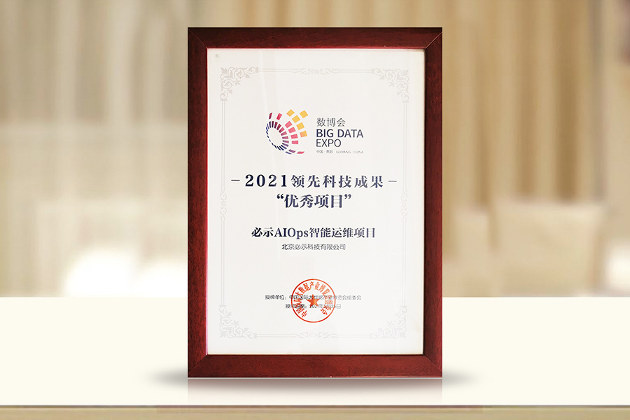 2021年,数博会共征集到560项大数据及相关领域的科技成果,最终评选出49个获奖项目,以及100个项目获得2021领先科技成果优秀项目殊荣。必示科技荣获“2021数博会领先科技成果优秀项目奖”,成为唯一获此殊荣的AIOps智能运维企业。