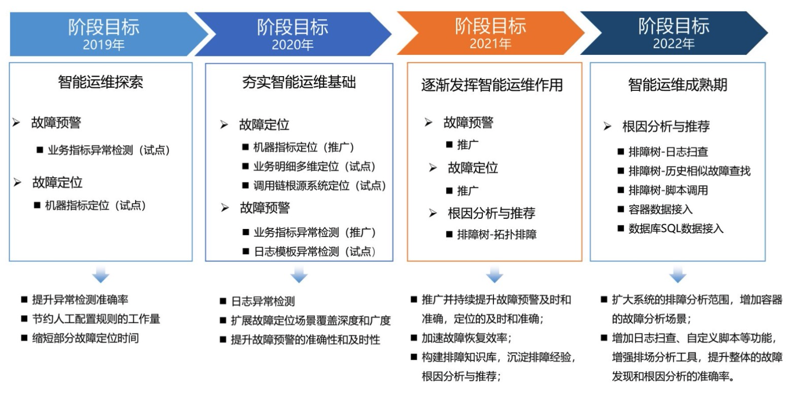 在项目建设之初,该银行将智能运维系统效果的目标设定为“十分钟定位问题、十分钟恢复服务”。而与之对应现实的状况是:故障发现依赖于业务部门报障或者银行储户报障、运维数据质量参差不齐、排账依赖专家经验、故障定位基本靠人肉...面对目标与现实状况差距较大的状况,他们并没有追求一步到位,而是分解成多期建设小目标,从2019年到2022年,目前以建设四期,每期都有科学合理可量化的目标。