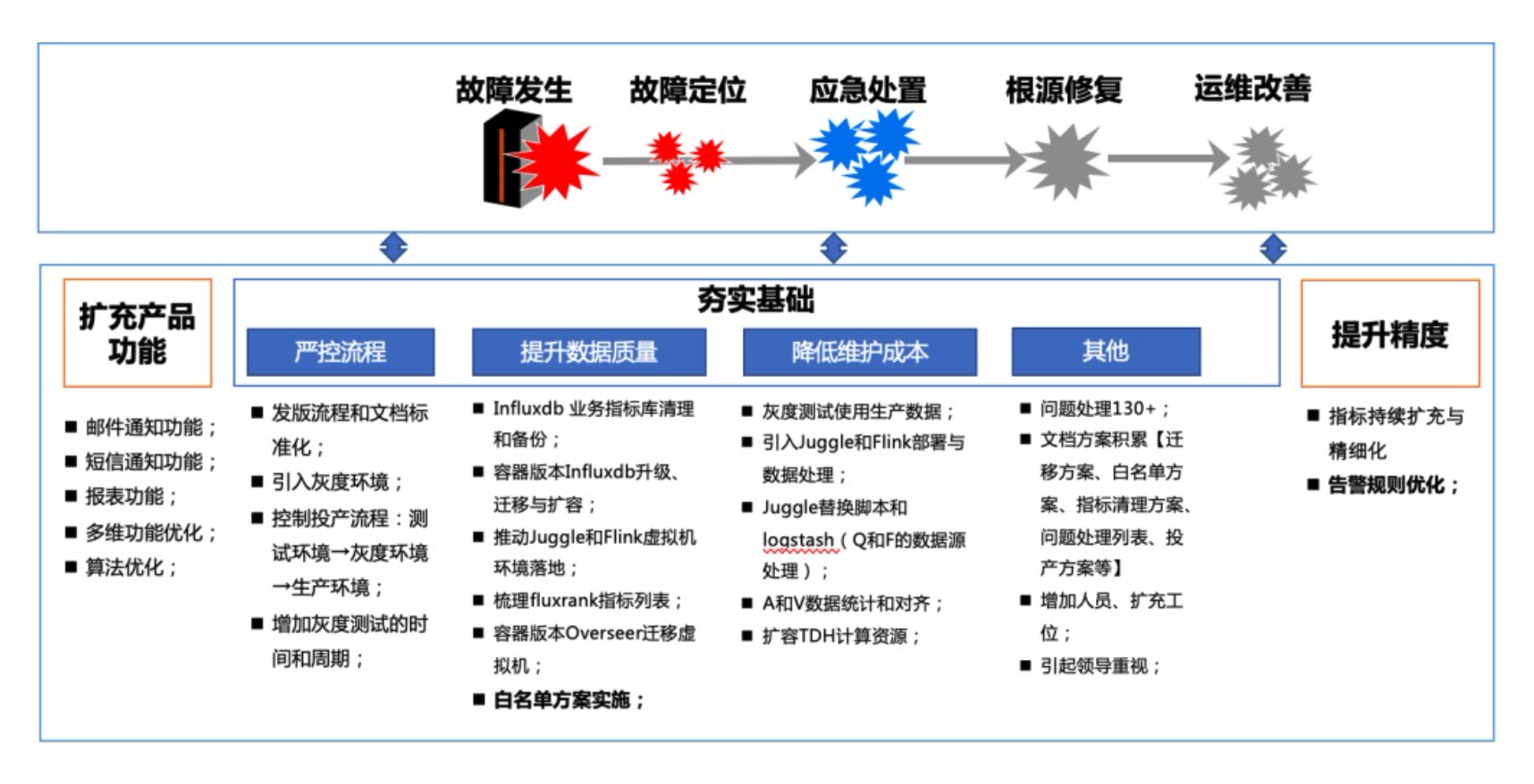 过程中通过当前对手边影响“出效果”的失效因素在细节上不断微雕,从量变到质变,使他们向着“出效果”不断迈进。如:通过持续的白名单方案实施,解决低效数据的问题,保障数据质量和算法对齐,提升告警准确率;通过持续的指标扩充与精细化,不断提升故障定位的精度和准度;通过告警规则的持续优化,让告警通知趋于真实可靠。