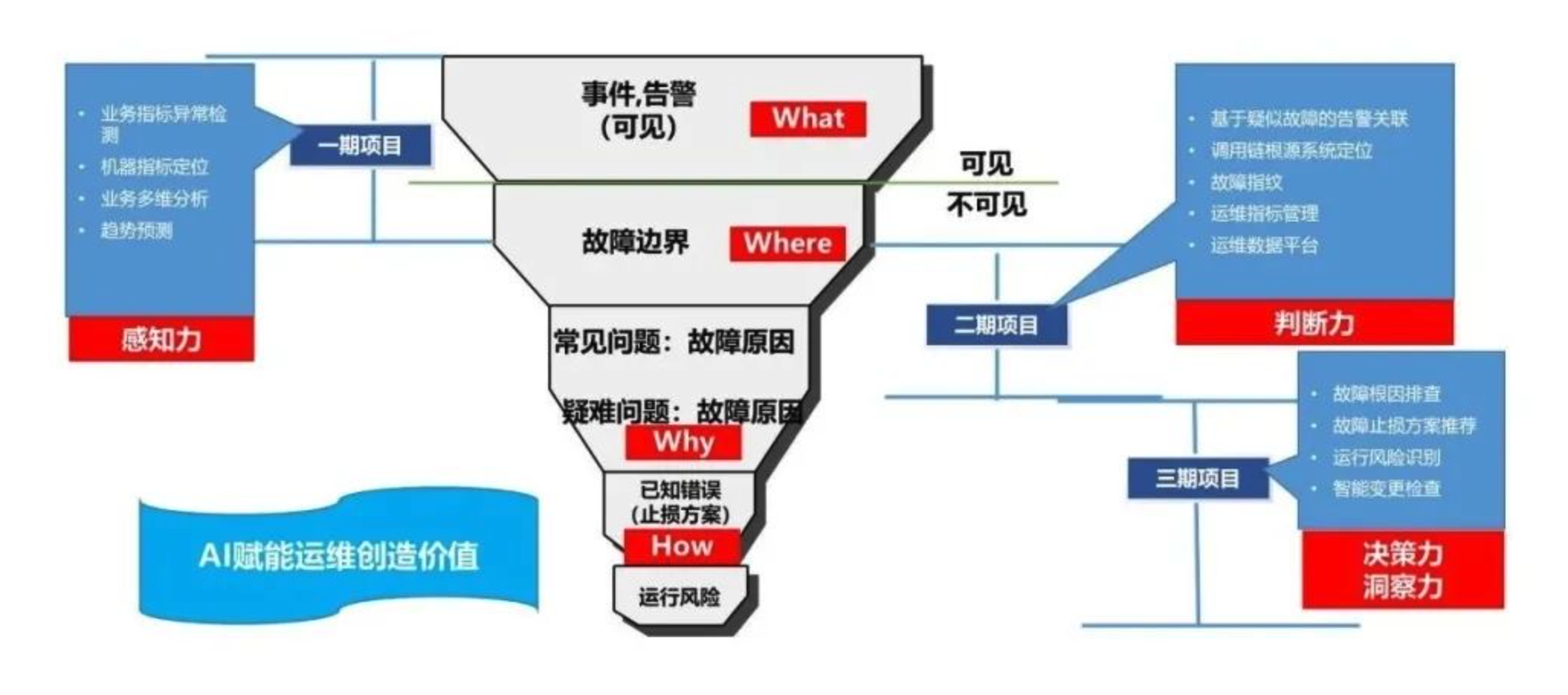 对智能运维系统目标逐步实现的过程遵循从被动到主动,从可见到不可见,从简单到复杂的迭代原则,从感知力(业务指标异常检测、机器指标定位、业务多维分析、趋势预测),到判断力(基于疑似故障的告警关联、调用链根源系统定位、故障指纹、运维指标管理、运维数据平台),再到决策力和洞察力的建设(故障根因排查、故障止损方案推荐、运行风险识别、智能变更检查等),逐步创造智能运维价值,实现最终效果的“星辰大海”。