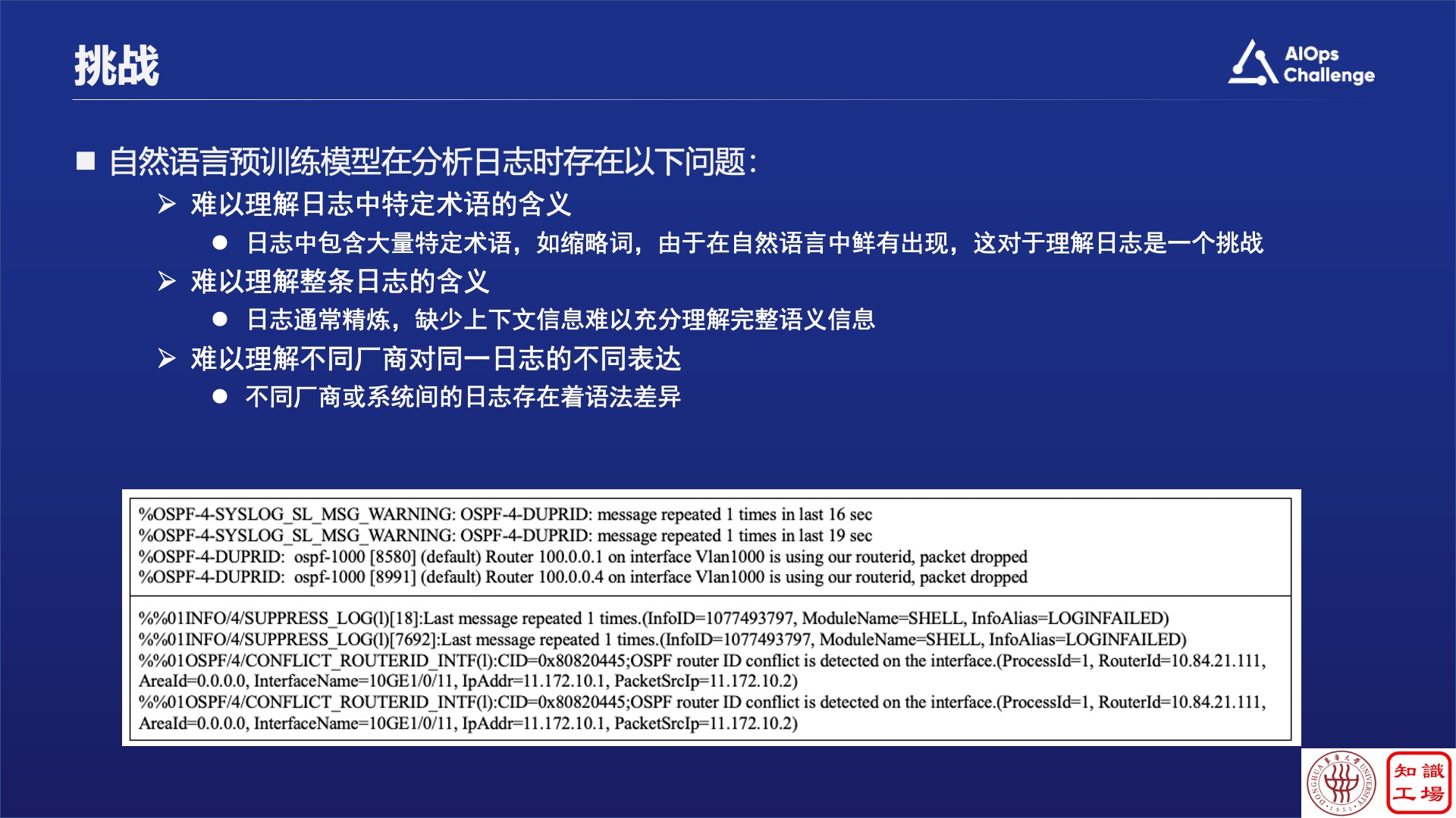 第二,从整体来讲,通用的预训练语言模型不理解日志到底在说什么,就像给非专业人士看日志文档,事实上也是看不懂的。