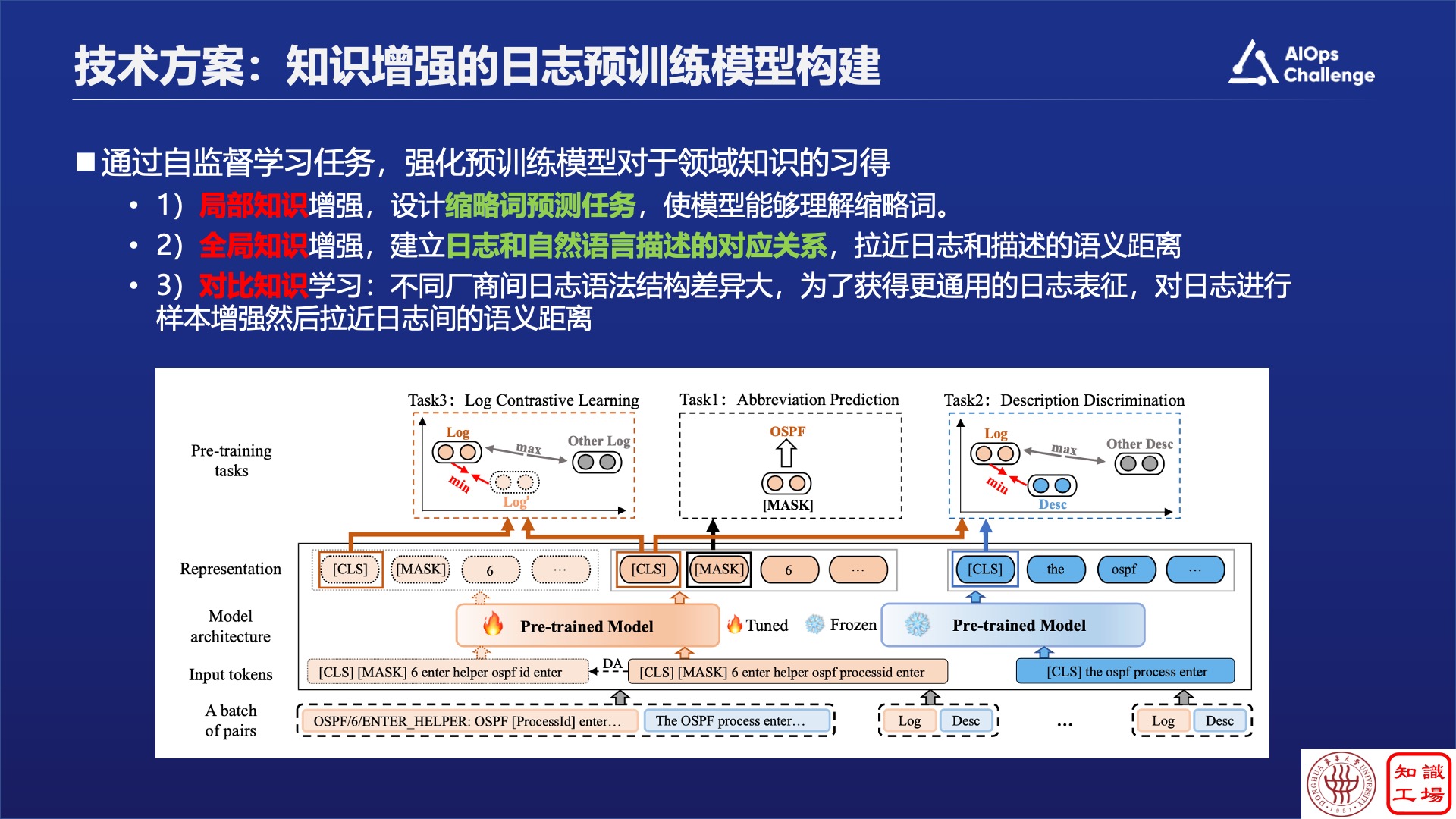 如果局部知识不懂,就看缩略词表,把局部知识补全。如果是全局知识不懂,就看全局知识描述的文档。基于以上,我们提出了知识增强的日志预训练模型的框架,该框架主要分为三部分: