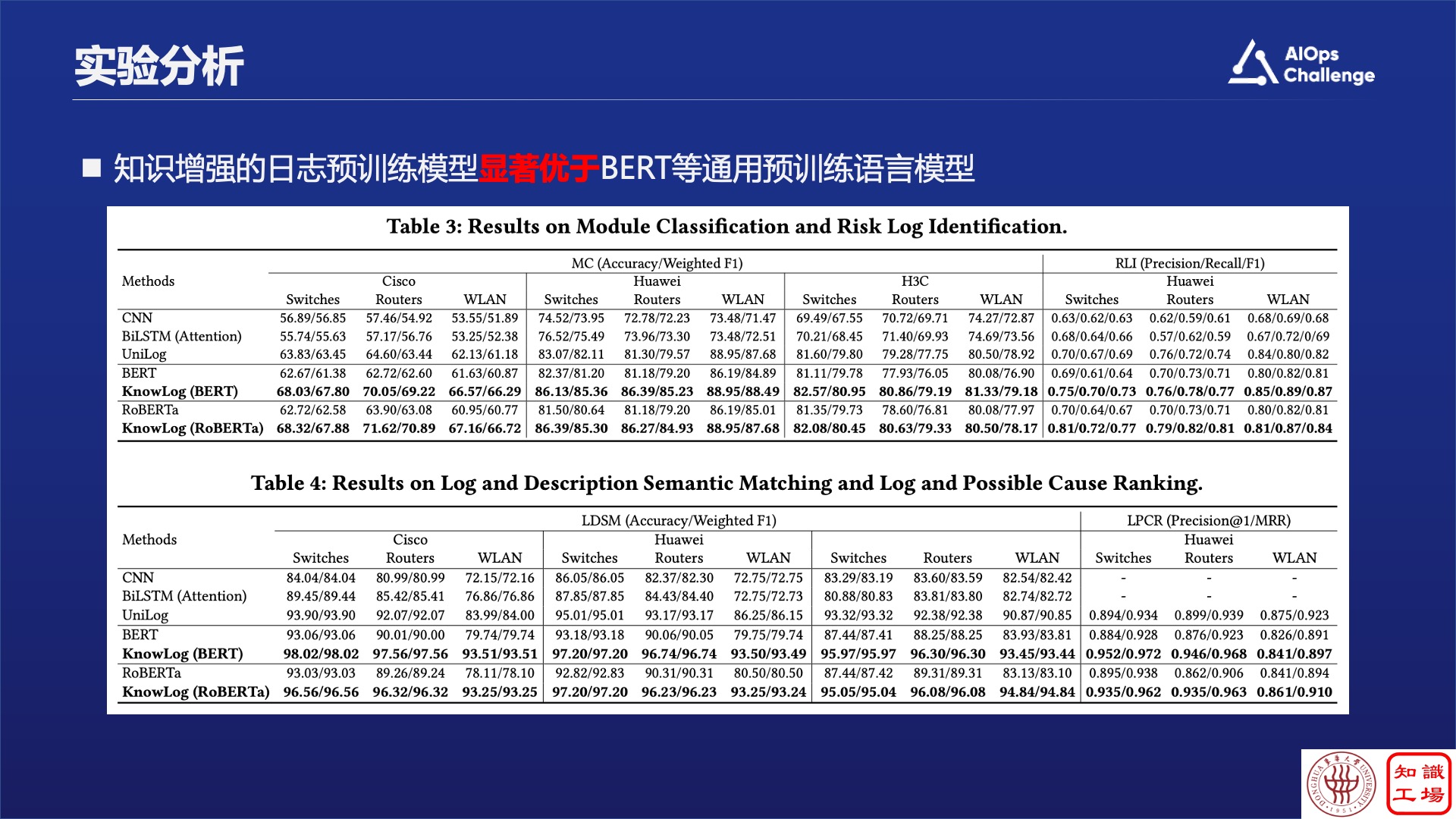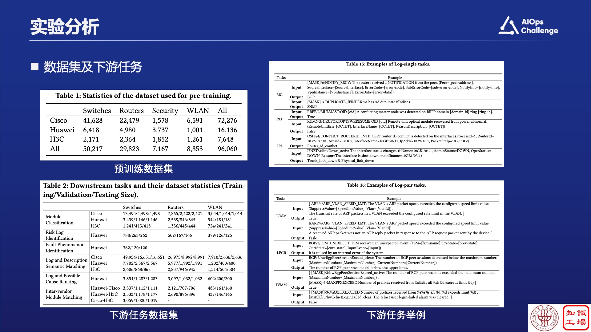 基于这个方法,我们构造了很多的实验,从华为、思科、华三等一些厂家提取日志模板。注意这里做了一个改进,就是我们没有去理解日志,而是去理解日志模板,因为日志很多,但是模板并不多。我们这边拿了10万条的日志模板,然后构造了一些下游任务,从而得到了几个结论: