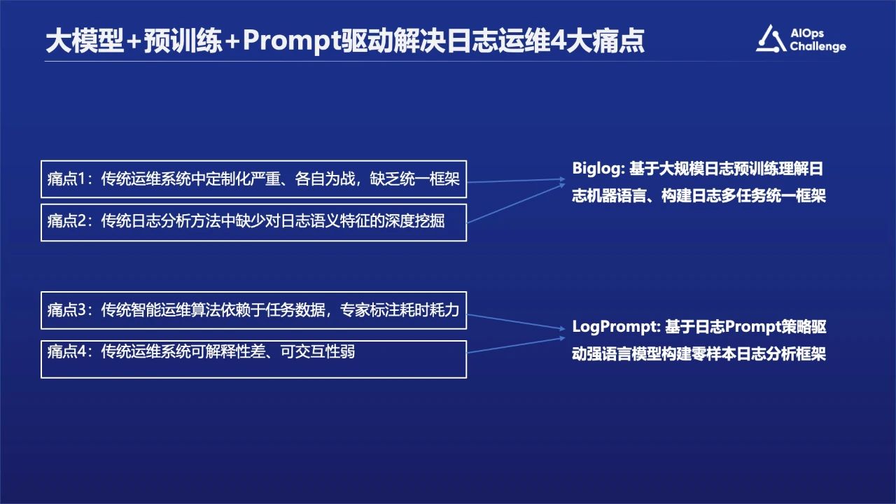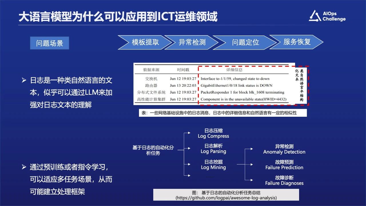 首先日志是一种类自然语言的文本,可以通过大语言模型加强对日志文本的理解。其次通过预训练或者指令学习,可以适应多任务场景,从而可能建立处理框架。