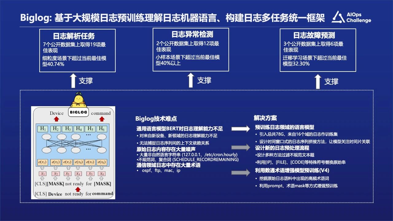 为了解决上述痛点问题,我们团队做了深入的研究工作,有两个解决方案,第一个就是Biglog, 基于大规模日志预训练理解日志机器语言、构建日志多任务统一框架,解决传统运维系统没有统一框架的问题和传统日志分析对于日志语义理解特征的一些痛点问题。我们是基于LogHub开源数据再加上自己的数据做的训练工作。