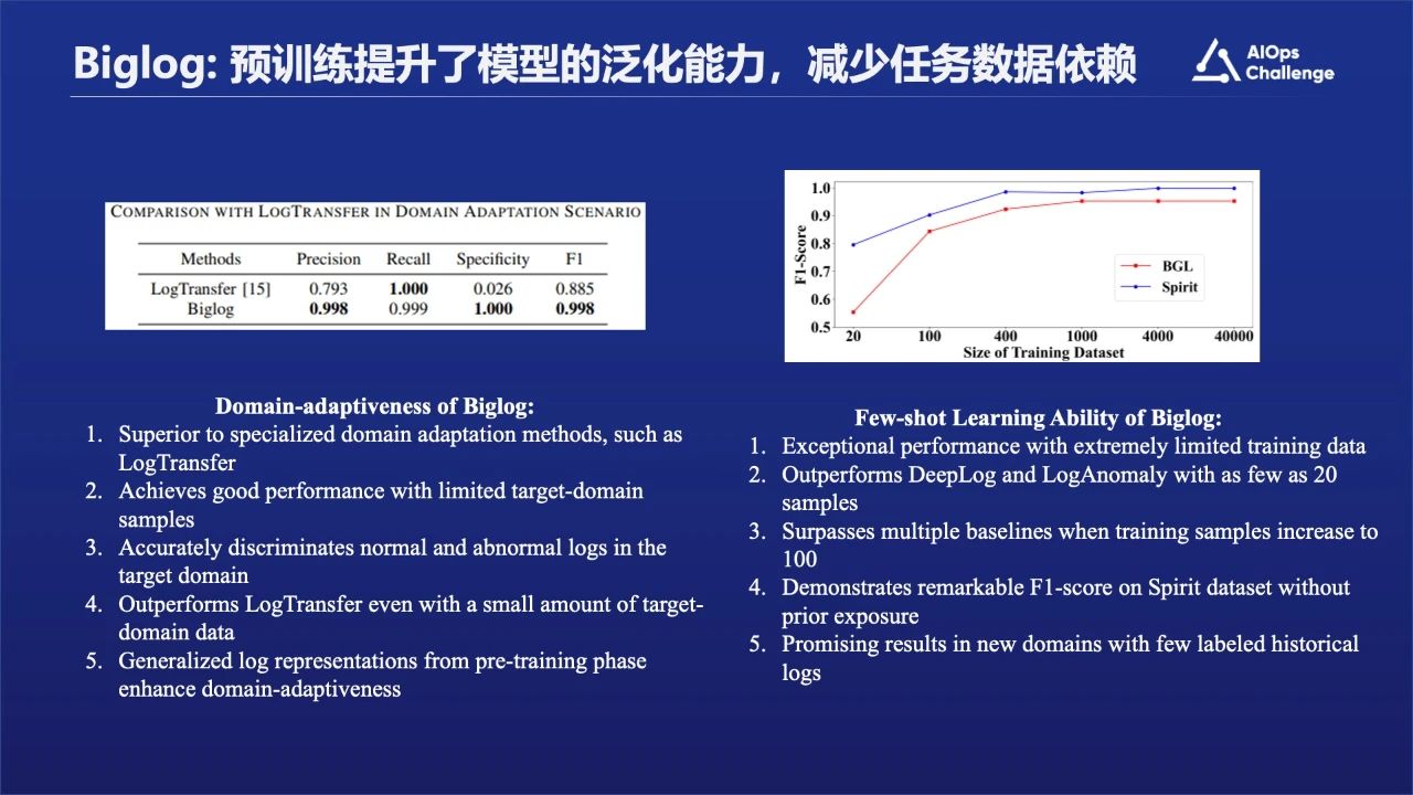 通过实验我们发现在领域迁移性方面,Biglog比LogTransfer表现的要好。另外我们做异常检测的时候,发现在Few-shot或者Zero-shot这块,模型也有很好的泛化能力。总体来说,当给它大概20个左右的samples时候,就已经可以达到非常不错的效果了。