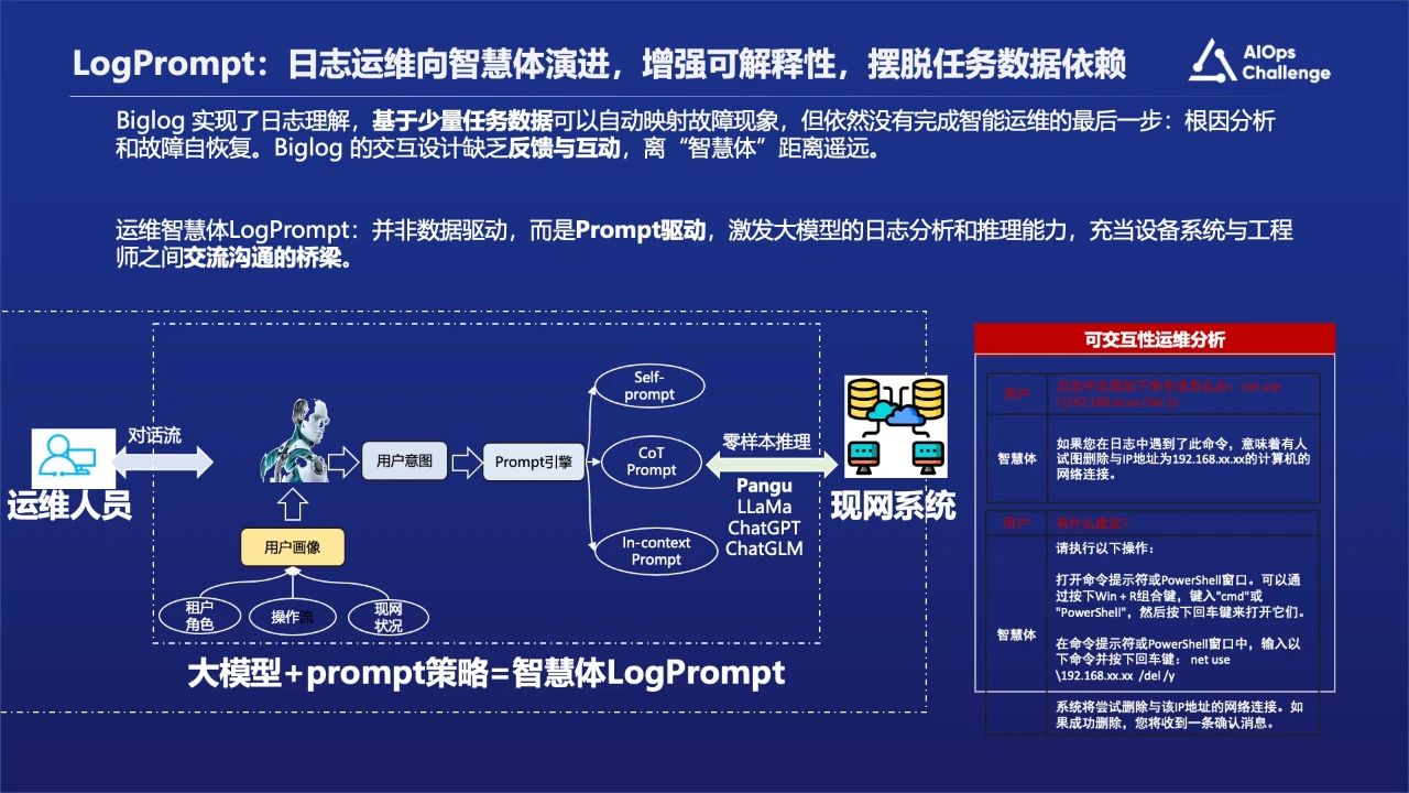 我们尝试了Prompt+LLM的机制,只要采用简单的一些 cot的 prompt以及上下文的信息,就能够把日志的解释性以及它的交互性得到比较好的应用。