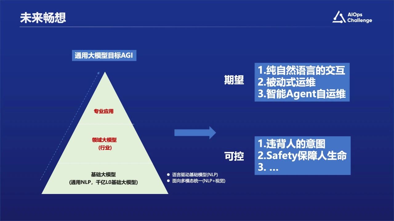 前面的各位专家已经分析了大语言模型可能带来的效果,从期望角度来说未来运维工作有可能是一个纯自然语言的交互,本身自然语言就是一个比较好的交互方式;也可能是被动式运维,当出现问题之后需要通过语言查询获取反馈结果;或者是智能化的Agent级的自运维,比如网络自动驾驶等。当然可能会面临一个问题:运维系统或者 Agent本身可能会违背人的意图,造成安全隐患。假设它能控制Agent的话,我们怎么做到安全可控。