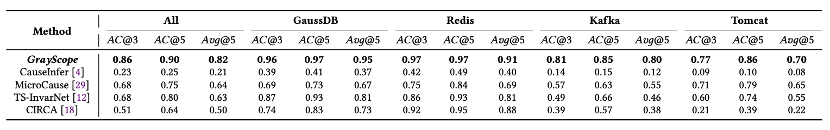 文章对比了GrayScope与4个指标根因定位方法。为了评估方法在不同应用场景中的准确性,文章选用了四个应用场景:高斯数据库(GaussDB)、Redis数据库(Redis)、Kafka分布式发布订阅消息系统(Kafka)和Tomcat应用服务(Tomcat)。最终的实验结果如表1所示。在总体性能方面,GrayScope优于其他方法,其Avg@5达到了0.82,与第二名相比提高了18%,说明结合专家知识以捕捉更准确的因果关系,并将部分相关性与异常程度相结合以进行根本原因推断,这两点增强了GrayScope的有效性。