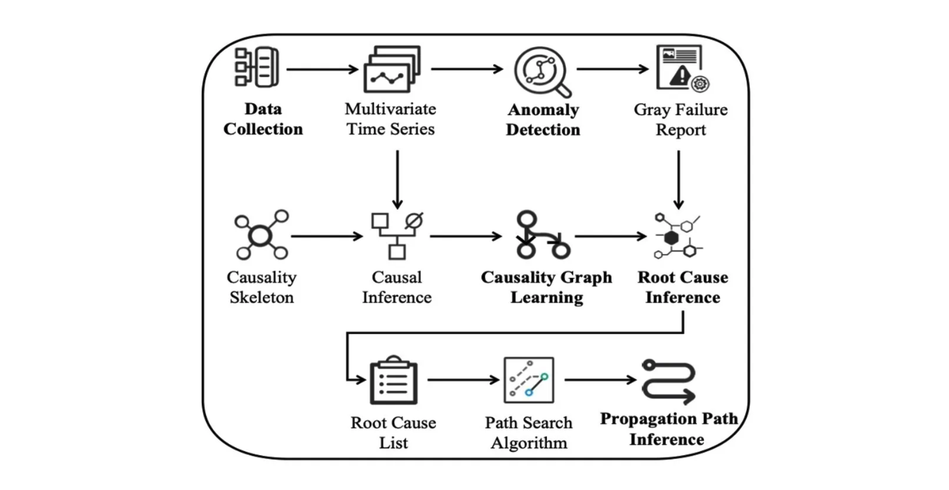 由于缺乏实用的细粒度诊断工具,要准确定位灰度故障需要耗费大量人力物力,运维人员需要反复尝试才能排除故障。此类故障严重影响了系统的性能和可用性,但有关灰度故障根因定位的研究却相对较少。一些侵入式方法由于修改源码成本高、定位周期长,限制了它们的实际应用。传统的统计分析方法在进行根因定位时容易受到数据噪声的影响。使用机器学习技术从指标数据中学习特征模型进行根因定位通常依赖于许多高质量的标注案例。基于因果图的方法可以学习因果图并获得潜在的根因列表,在现实世界的根因定位中表现出卓越的性能,它们有望在服务器操作系统中实现基于指标的非侵入式灰度故障定位。