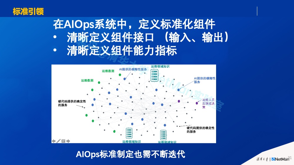 我觉得前述原则3中的 AIOps系统架构可以作为AIOps标准化的一个依据。具体思路是:针对常见组件(比如业务指标异常检测),把它作为一个软件服务来看待, 清晰定义其:1)输入格式要求、采样间隔要求、质量要求;2)输出格式及质量要求;3)组件能力指标(如误报率、漏报率、检测延迟等)。同时定义组件之间的关系,比如异常检测结果输出给根因定位模块。