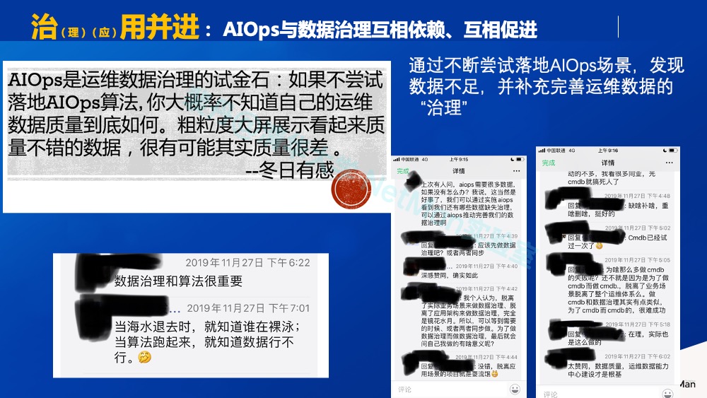 数据质量在AIOps落地效果的重要性毋庸置疑。但是数据治理和AIOps应用孰先孰后呢?这一点其实是比较有争议的。一种观点是“要先做好数据治理,才可能做AIOps落地”。听起来很有道理。的确,数据不行怎么出效果呢?但是,根据我20余年AIOps落地经验,我旗帜鲜明地反对 “先泛泛做数据治理,再AIOps落地”的做法。大家可以看一下下图中我微信朋友圈的讨论,其中的一个精华留言是 “脱离实际业务场景来做数据治理和脱离了应用架构来做数据治理,完全是镜花水月”, 我深表赞同。