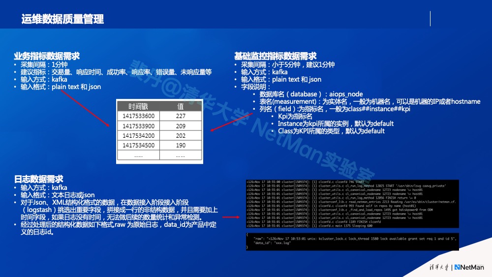 在第二个例子(见下图),我们列举了一些之前落地实践中总结出来的具体场景(如业务指标异常检测、机器指标异常定位)中各自的数据质量要求。如果说达到了这个要求,就可以保证出效果,如果达不到这个要求,效果就会打折扣。这个怎么来的呢?一定是在实践中总结出来的,而不是泛泛地依赖数据治理得来的。当然这些已经总结出来的在特定场景下的数据质量要求可以用于指导一家新机构在进行AIOps落地这些特定场景前的数据治理。