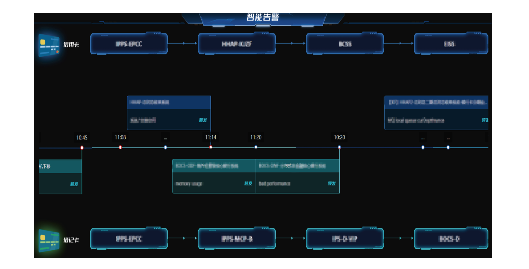 智能应急大屏 发布时间:2023-12-28 17:09:26 通过故事化的场景和直觉化的设计,让应急排障不再困难,通过构建智能摘要大屏、智能推荐大屏和智能告警大屏,让一线人员可以直观且全面的感受和理解数据信息。 告警推荐大屏:通过智能算法提供异常程度最高的Top5业务系统,同时展示每个业务系统中最需要关注的告警描述、告警 等级及时序特征三类关键信息,辅助管理员进行快速故障排查。 智能告警大屏:以时序图的方式清晰展现告警脉络,同时从应用视角展示故障传播情况,辅助管理员快速进行告警追根溯源。 分享到0 上一篇:告警风暴分析 下一篇:拓扑排障